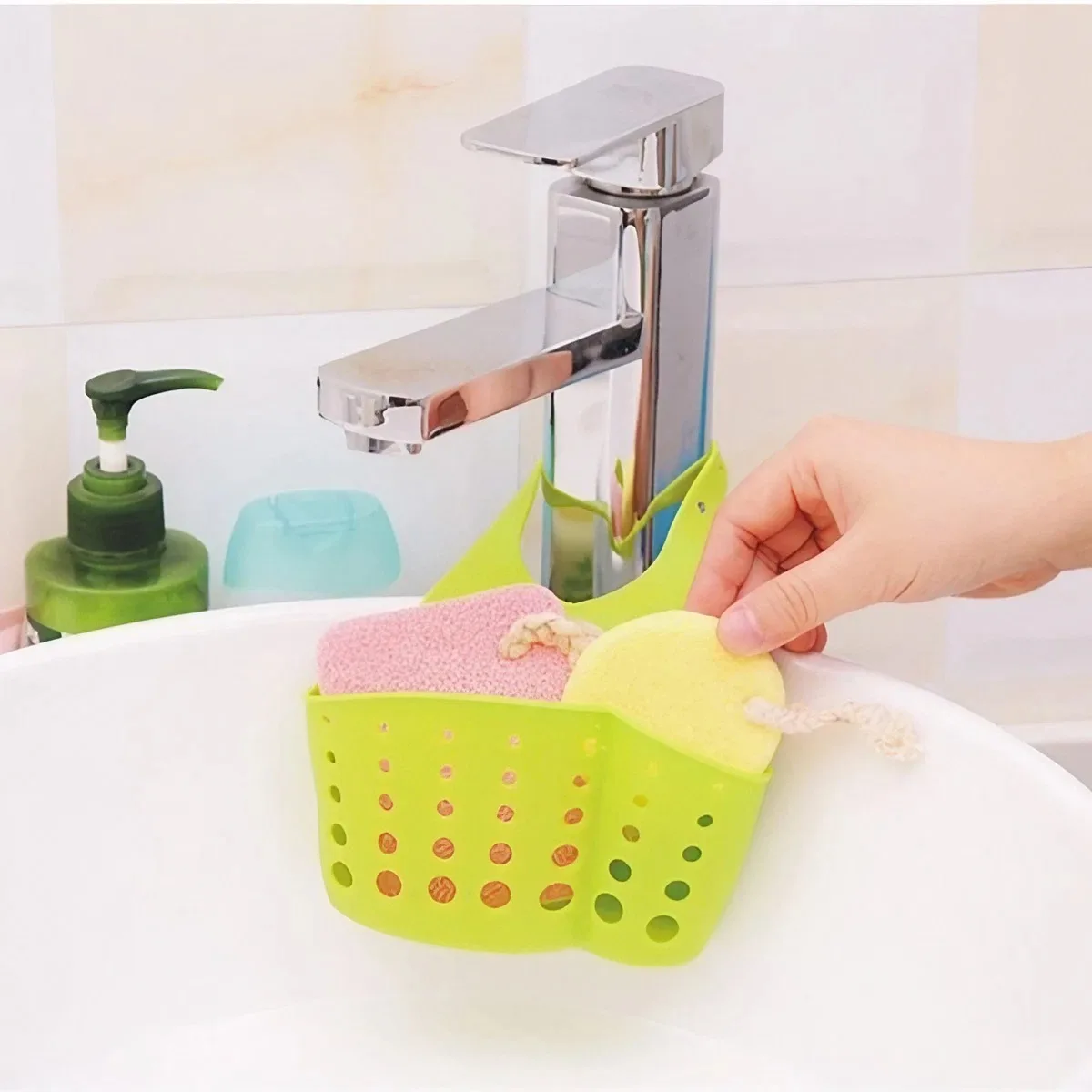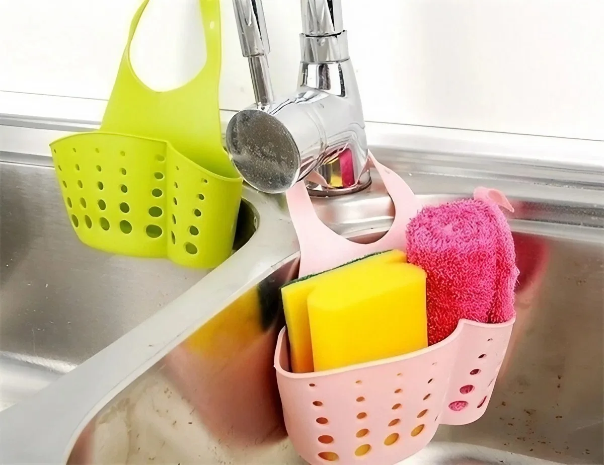 Can be hung in the kitchen, the faucet of the bathroom, with sponge, face towel, razor, etc., dry in the hollow drain at the bottom, not easy to breed bacteria